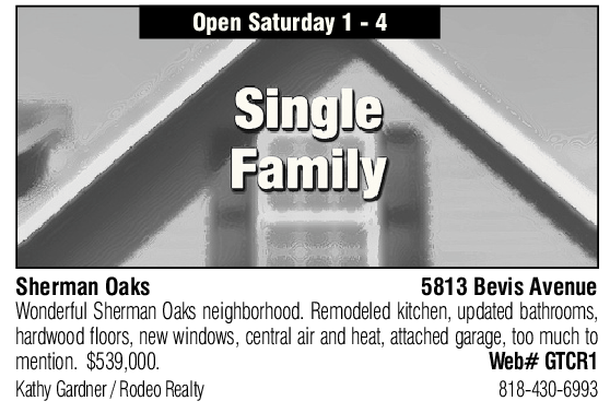 Open Saturday 1 - 4 Sherman Oaks 5813 Bevis Avenue Wonderful Sherman Oaks neighborhood. Remodeled kitchen, updated bathrooms, hardwood floors, new windows, central air and heat, attached garage, too much to mention. $539,000. Web# GTCR1 Kathy Gardner / Rodeo Realty 818-430-6993