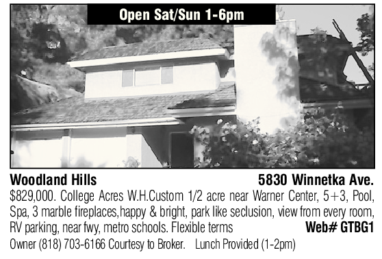 Open Sat/Sun 1-6pm Woodland Hills 5830 Winnetka Ave. $829,000. College Acres W.H.Custom 1/2 acre near Warner Center, 5+3, Pool, Spa, 3 marble fireplaces,happy & bright, park like seclusion, view from every room, RV parking, near fwy, metro schools. Flexible terms Web# GTBG1 Owner (818) 703-6166 Courtesy to Broker. Lunch Provided (1-2pm)