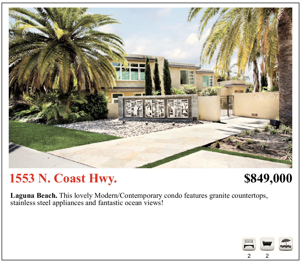 Laguna Beach. This lovely Modern/Contemporary condo features granite countertops, stainless steel appliances and fantastic ocean views!