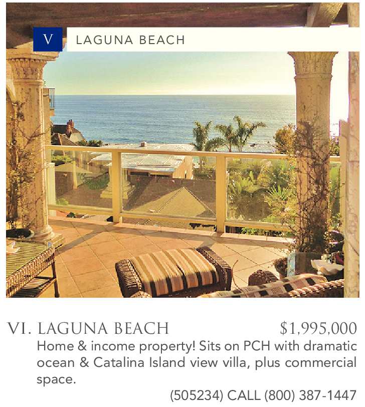 VI. LAGUNA BEACH $1,995,000 Home & income property! Sits on PCH with dramatic ocean & Catalina Island view villa, plus commercial space.
