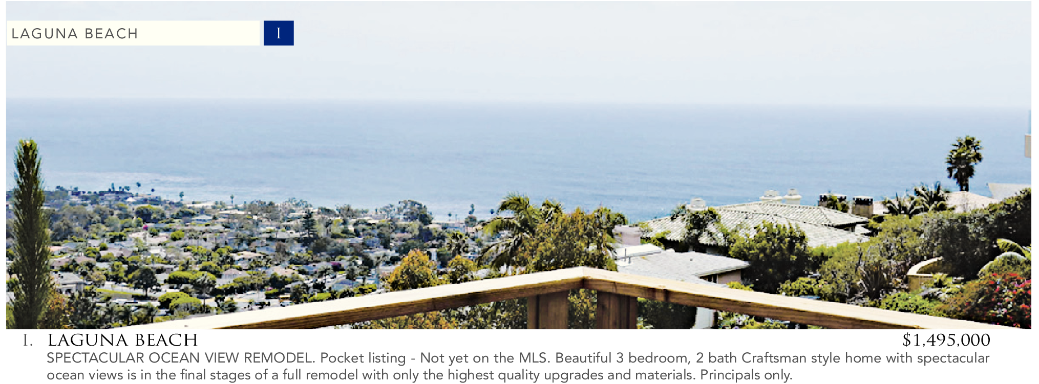 LAGUNA BEACH I I. LAGUNA BEACH $1,495,000 SPECTACULAR OCEAN VIEW REMODEL. Pocket listing - Not yet on the MLS. Beautiful 3 bedroom, 2 bath Craftsman style home with spectacular ocean views is in the final stages of a full remodel with only the highest quality upgrades and materials. Principals only.