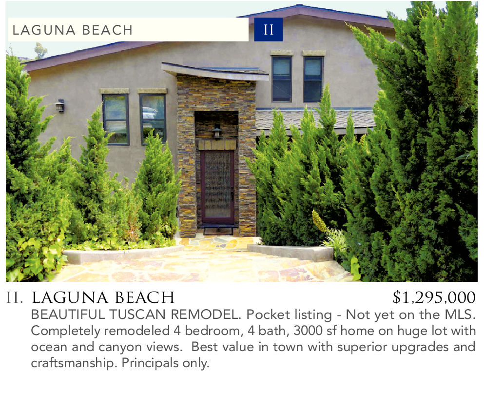 II. LAGUNA BEACH $1,295,000 BEAUTIFUL TUSCAN REMODEL. Pocket listing - Not yet on the MLS. Completely remodeled 4 bedroom, 4 bath, 3000 sf home on huge lot with ocean and canyon views. Best value in town with superior upgrades and craftsmanship. Principals only.