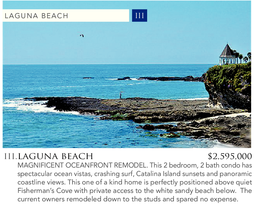 LAGUNA BEACH III III. LAGUNA BEACH $2,595,000 MAGNIFICENT OCEANFRONT REMODEL. This 2 bedroom, 2 bath condo has spectacular ocean vistas, crashing surf, Catalina Island sunsets and panoramic coastline views. This one of a kind home is perfectly positioned above quiet Fisherman’s Cove with private access to the white sandy beach below. The current owners remodeled down to the studs and spared no expense.