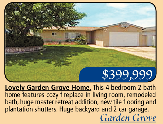 Lovely Garden Grove Home. This 4 bedroom 2 bath home features cozy fireplace in living room, remodeled bath, huge master retreat addition, new tile flooring and plantation shutters. Huge backyard and 2 car garage.