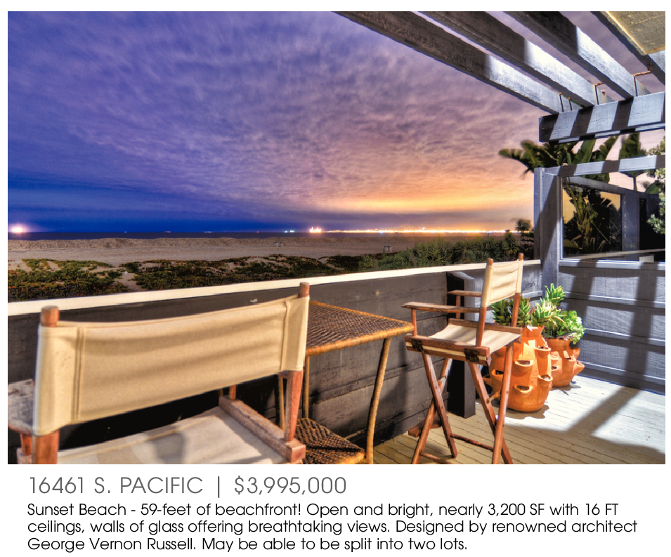 16461 S. PACIFIC | $3,995,000 Sunset Beach - 59-feet of beachfront! Open and bright, nearly 3,200 SF with 16 FT ceilings, walls of glass offering breathtaking views. Designed by renowned architect George Vernon Russell. May be able to be split into two lots.