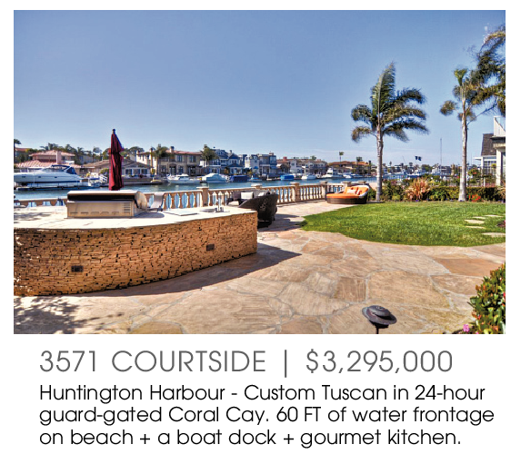 3571 COURTSIDE | $3,295,000 Huntington Harbour - Custom Tuscan in 24-hour guard-gated Coral Cay. 60 FT of water frontage on beach + a boat dock + gourmet kitchen.