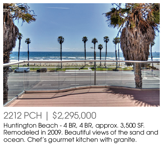 2212 PCH | $2,295,000 Huntington Beach - 4 BR, 4 BR, approx. 3,500 SF. Remodeled in 2009. Beautiful views of the sand and ocean. Chef’s gourmet kitchen with granite.