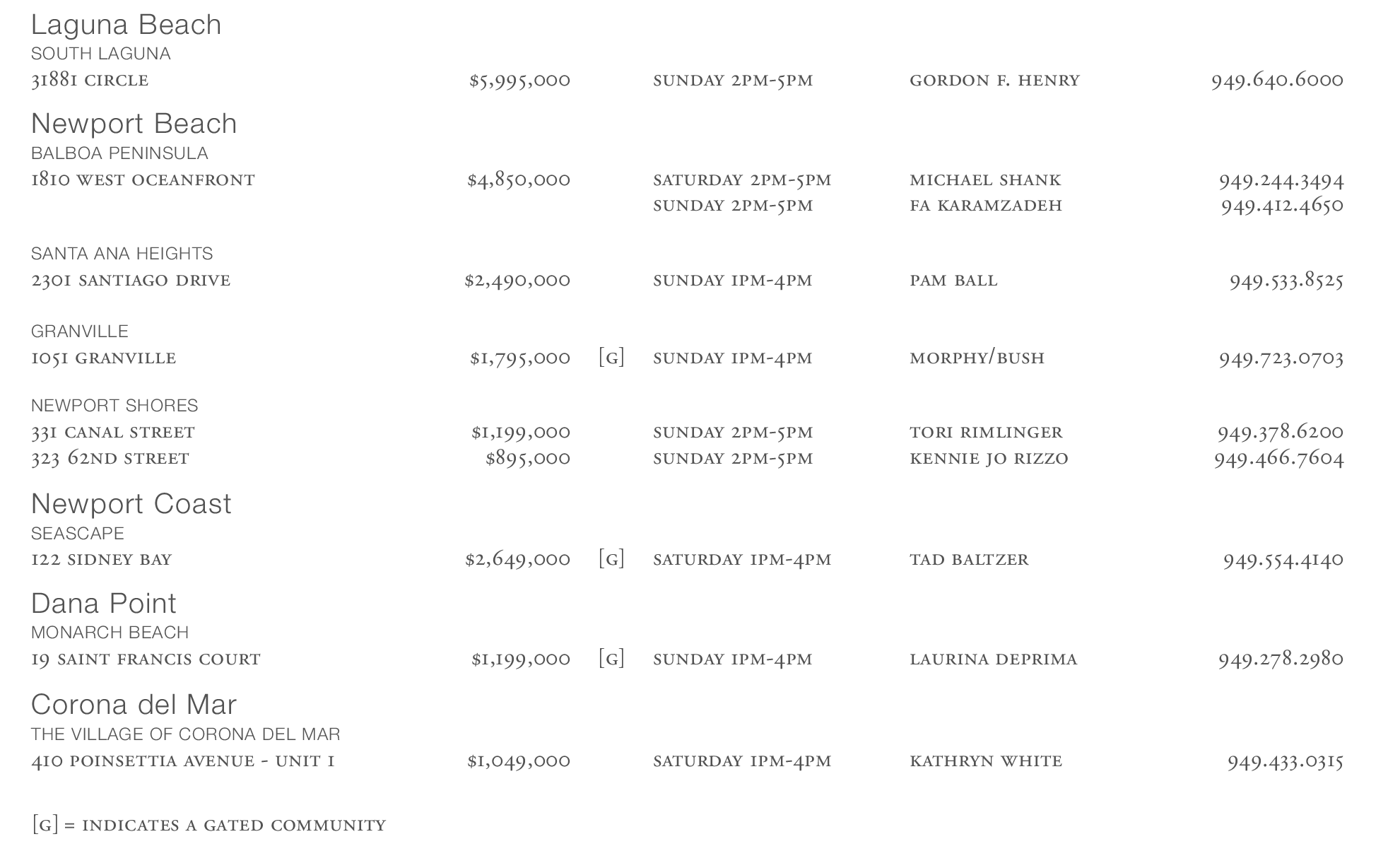 Laguna Beach SOUTH LAGUNA 31881 circle $5,995,000 sunday 2pm-5pm gordon f. henry 949.640.6000 Newport Beach BALBOA PENINSULA 1810 west oceanfront $4,850,000 saturday 2pm-5pm michael shank 949.244.3494 sunday 2pm-5pm fa karamzadeh 949.412.4650 SANTA ANA HEIGHTS 2301 santiago drive $2,490,000 sunday 1pm-4pm pam ball 949.533.8525 GRANVILLE 1051 granville $1,795,000 [g] sunday 1pm-4pm morphy/bush 949.723.0703 NEWPORT SHORES 331 canal street $1,199,000 sunday 2pm-5pm tori rimlinger 949.378.6200 323 62nd street $895,000 sunday 2pm-5pm kennie jo rizzo 949.466.7604 Newport Coast SEASCAPE 122 sidney bay $2,649,000 [g] saturday 1pm-4pm tad baltzer 949.554.4140 Dana Point MONARCH BEACH 19 saint francis court $1,199,000 [g] sunday 1pm-4pm laurina deprima 949.278.2980 Corona del Mar THE VILLAGE OF CORONA DEL MAR 410 poinsettia avenue - unit 1 $1,049,000 saturday 1pm-4pm kathryn white 949.433.0315 [g] = indicates a gated community