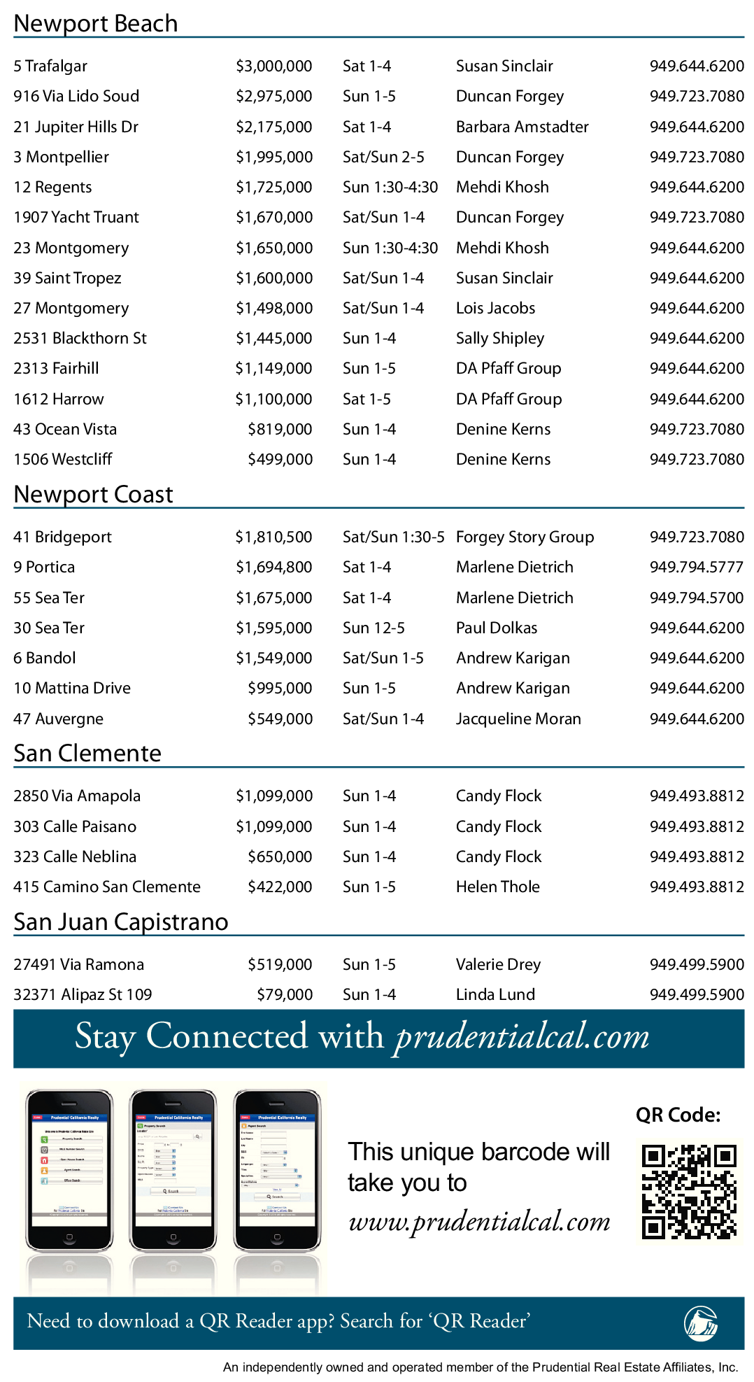 5 Trafalgar $3,000,000 Sat 1-4 Susan Sinclair 949.644.6200 916 Via Lido Soud $2,975,000 Sun 1-5 Duncan Forgey 949.723.7080 21 Jupiter Hills Dr $2,175,000 Sat 1-4 Barbara Amstadter 949.644.6200 3 Montpellier $1,995,000 Sat/Sun 2-5 Duncan Forgey 949.723.7080 12 Regents $1,725,000 Sun 1:30-4:30 Mehdi Khosh 949.644.6200 1907 Yacht Truant $1,670,000 Sat/Sun 1-4 Duncan Forgey 949.723.7080 23 Montgomery $1,650,000 Sun 1:30-4:30 Mehdi Khosh 949.644.6200 39 Saint Tropez $1,600,000 Sat/Sun 1-4 Susan Sinclair 949.644.6200 27 Montgomery $1,498,000 Sat/Sun 1-4 Lois Jacobs 949.644.6200 2531 Blackthorn St $1,445,000 Sun 1-4 Sally Shipley 949.644.6200 2313 Fairhill $1,149,000 Sun 1-5 DA Pfaff Group 949.644.6200 1612 Harrow $1,100,000 Sat 1-5 DA Pfaff Group 949.644.6200 43 Ocean Vista $819,000 Sun 1-4 Denine Kerns 949.723.7080 1506 Westcliff $499,000 Sun 1-4 Denine Kerns 949.723.7080