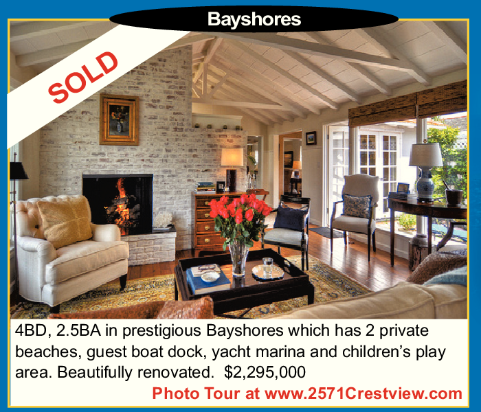 4BD, 2.5BA in prestigious Bayshores which has 2 private beaches, guest boat dock, yacht marina and children’s play area. Beautifully renovated. $2,295,000 Photo Tour at www.2571Crestview.com