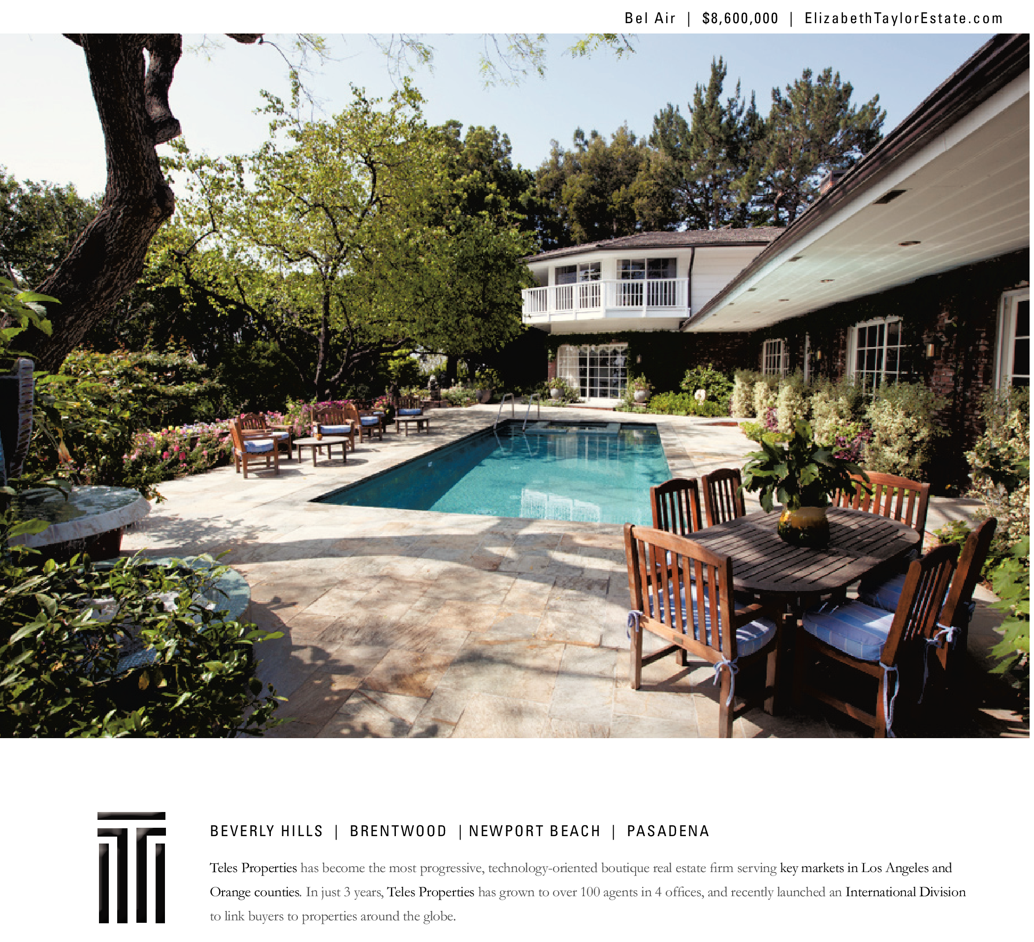 BEVERLY HILLS | BRENTWOOD | NEWPORT BEACH | PASADENA Teles Properties has become the most progressive, technology-oriented boutique real estate firm serving key markets in Los Angeles and Orange counties. In just 3 years, Teles Properties has grown to over 100 agents in 4 offices, and recently launched an International Division to link buyers to properties around the globe. Bel Air | $8,600,000 | ElizabethTaylorEstate.com