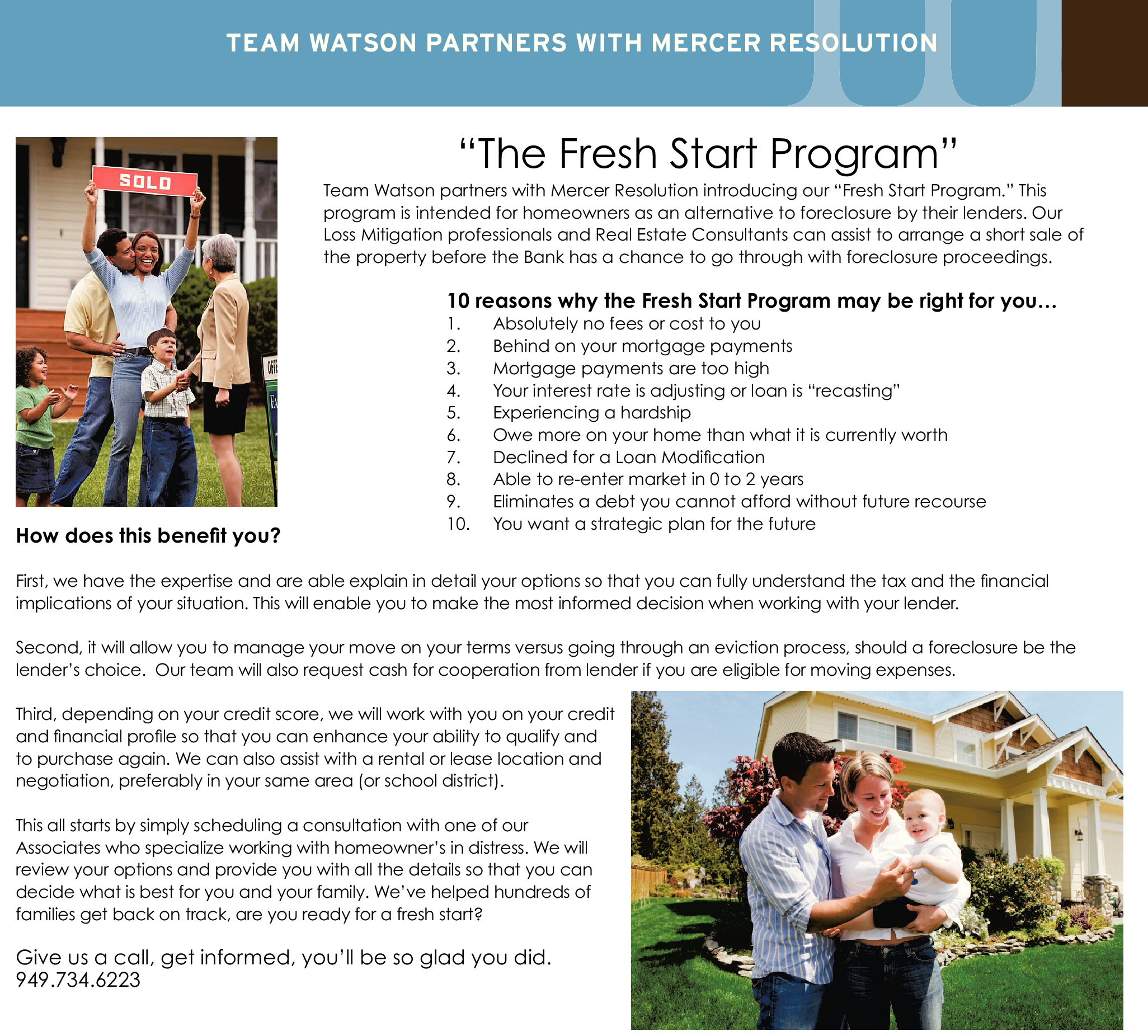How does this benefit you? TEAM WATSON PARTNERS WITH MERCER RESOLUTION “The Fresh Start Program” First, we have the expertise and are able explain in detail your options so that you can fully understand the tax and the financial implications of your situation. This will enable you to make the most informed decision when working with your lender. Second, it will allow you to manage your move on your terms versus going through an eviction process, should a foreclosure be the lender’s choice. Our team will also request cash for cooperation from lender if you are eligible for moving expenses. Third, depending on your credit score, we will work with you on your credit and financial profile so that you can enhance your ability to qualify and to purchase again. We can also assist with a rental or lease location and negotiation, preferably in your same area (or school district). This all starts by simply scheduling a consultation with one of our Associates who specialize working with homeowner’s in distress. We will review your options and provide you with all the details so that you can decide what is best for you and your family. We’ve helped hundreds of families get back on track, are you ready for a fresh start? Give us a call, get informed, you’ll be so glad you did. 949.734.6223 Team Watson partners with Mercer Resolution introducing our “Fresh Start Program.” This program is intended for homeowners as an alternative to foreclosure by their lenders. Our Loss Mitigation professionals and Real Estate Consultants can assist to arrange a short sale of the property before the Bank has a chance to go through with foreclosure proceedings. 10 reasons why the Fresh Start Program may be right for you… 1. Absolutely no fees or cost to you 2. Behind on your mortgage payments 3. Mortgage payments are too high 4. Your interest rate is adjusting or loan is “recasting” 5. Experiencing a hardship 6. Owe more on your home than what it is currently worth 7. Declined for a Loan Modification 8. Able to re-enter market in 0 to 2 years 9. Eliminates a debt you cannot afford without future recourse 10. You want a strategic plan for the future