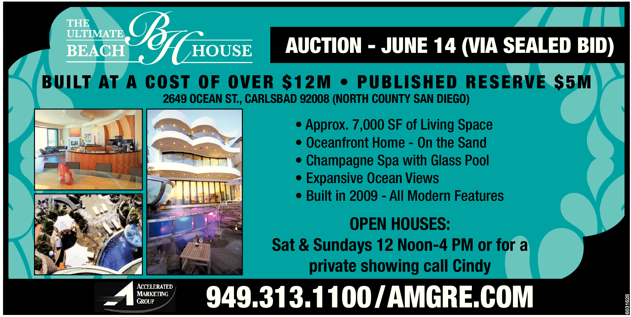 AUCTION - JUNE 14 (VIA SEALED BID) B U I LT AT A C O S T O F O V E R $ 1 2 M • P U B L I S H E D R E S E R V E $ 5 M 2649 OCEAN ST., CARLSBAD 92008 (NORTH COUNTY SAN DIEGO) • Approx. 7,000 SF of Living Space • Oceanfront Home - On the Sand • Champagne Spa with Glass Pool • Expansive Ocean Views • Built in 2009 - All Modern Features OPEN HOUSES: Sat & Sundays 12 Noon-4 PM or for a private showing call Cindy 949.313.1100 / AMGRE.COM