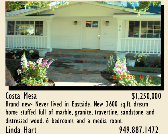Costa Mesa $1,250,000 Brand new- Never lived in Eastside. New 3600 sq.ft. dream home stuffed full of marble, granite, travertine, sandstone and distressed wood. 6 bedrooms and a media room. Linda Hart 949.887.1472
