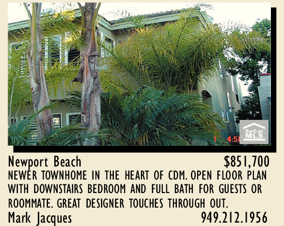 Newport Beach $851,700 NEWER TOWNHOME IN THE HEART OF CDM. OPEN FLOOR PLAN WITH DOWNSTAIRS BEDROOM AND FULL BATH FOR GUESTS OR ROOMMATE. GREAT DESIGNER TOUCHES THROUGH OUT. Mark Jacques 949.212.1956