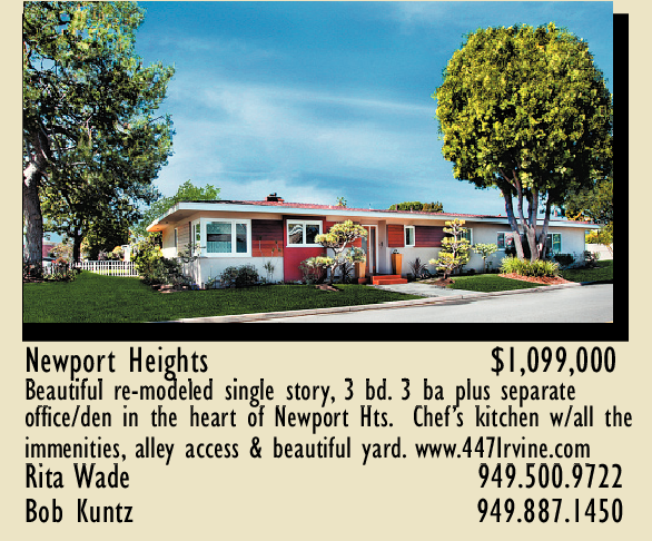 Newport Heights $1,099,000 Beautiful re-modeled single story, 3 bd. 3 ba plus separate office/den in the heart of Newport Hts. Chef’s kitchen w/all the immenities, alley access & beautiful yard. www.447Irvine.com Rita Wade 949.500.9722 Bob Kuntz 949.887.1450
