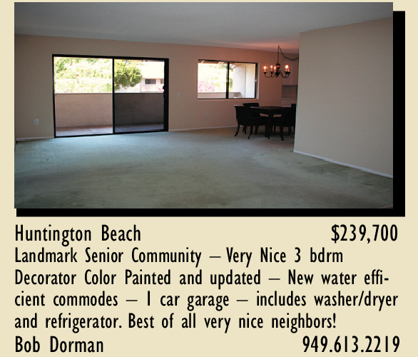 Huntington Beach $239,700 Landmark Senior Community – Very Nice 3 bdrm Decorator Color Painted and updated – New water efficient commodes – 1 car garage – includes washer/dryer and refrigerator. Best of all very nice neighbors! Bob Dorman 949.613.2219