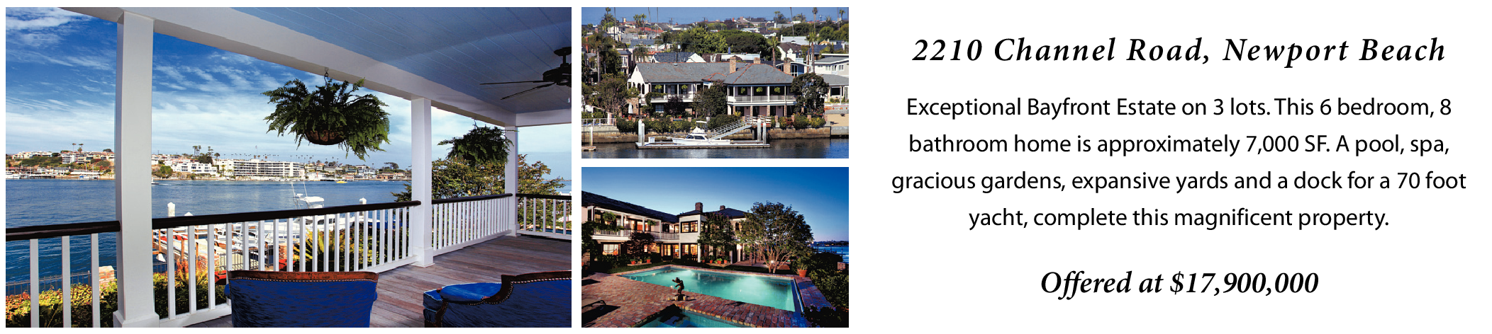 2210 Channel Road, Newport Beach Exceptional Bayfront Estate on 3 lots. This 6 bedroom, 8 bathroom home is approximately 7,000 SF. A pool, spa, gracious gardens, expansive yards and a dock for a 70 foot yacht, complete this magnificent property. Offered at $17,900,000