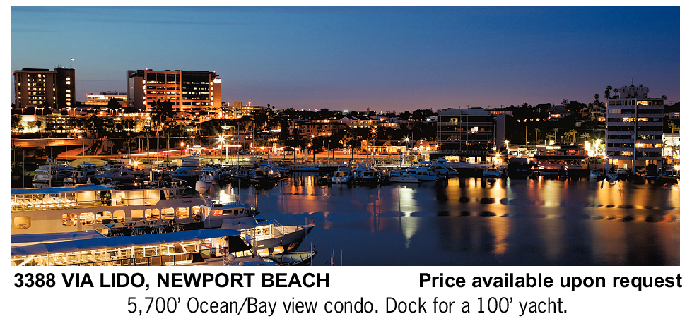 3388 VIA LIDO, NEWPORT BEACH Price available upon request 5,700’ Ocean/Bay view condo. Dock for a 100’ yacht.