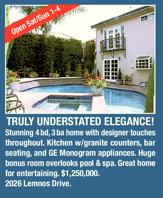 Stunning 4bd, 3ba home with designer touches throughout. Kitchen w/granite counters, bar seating, and GE Monogram appliances. Huge bonus room overlooks pool & spa. Great home for entertaining. $1,250,000. 2026 Lemnos Drive.
