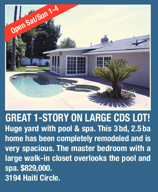 GREAT 1-STORY ON LARGE CDS LOT! Huge yard with pool & spa. This 3 bd, 2.5 ba home has been completely remodeled and is very spacious. The master bedroom with a large walk-in closet overlooks the pool and spa. $829,000. 3194 Haiti Circle.