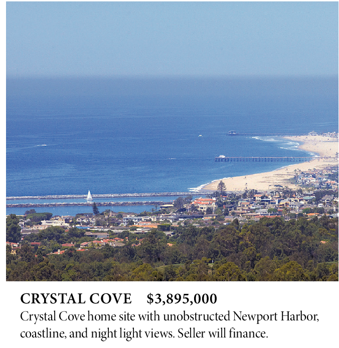 CRYSTAL COVE $3,895,000 Crystal Cove home site with unobstructed Newport Harbor, coastline, and night light views. Seller will finance.