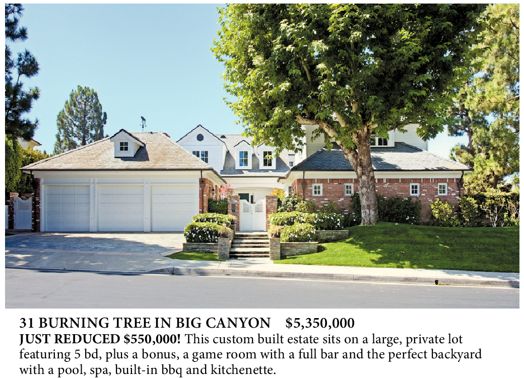 31 BURNING TREE IN BIG CANYON $5,350,000 JUST REDUCED $550,000! This custom built estate sits on a large, private lot featuring 5 bd, plus a bonus, a game room with a full bar and the perfect backyard with a pool, spa, built-in bbq and kitchenette.