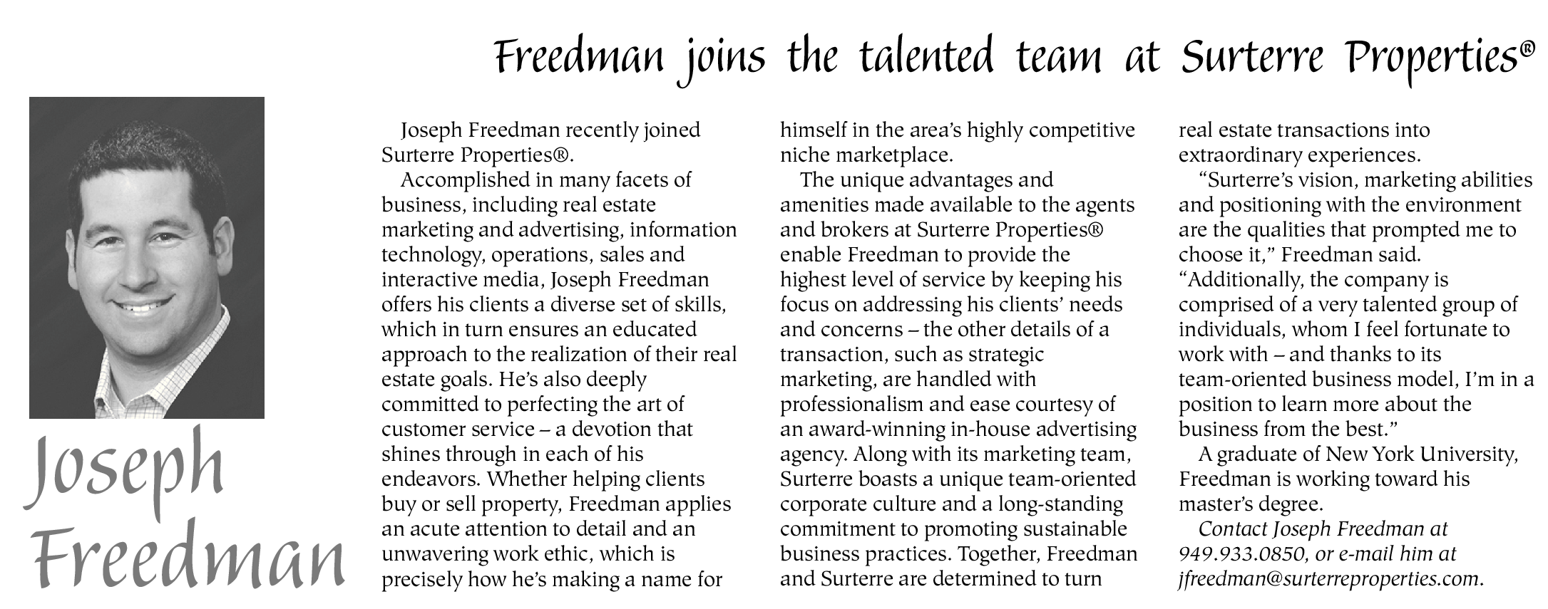 Contact Joseph Freedman at 949.933.0850, or e-mail him at jfreedman@surterreproperties.com.