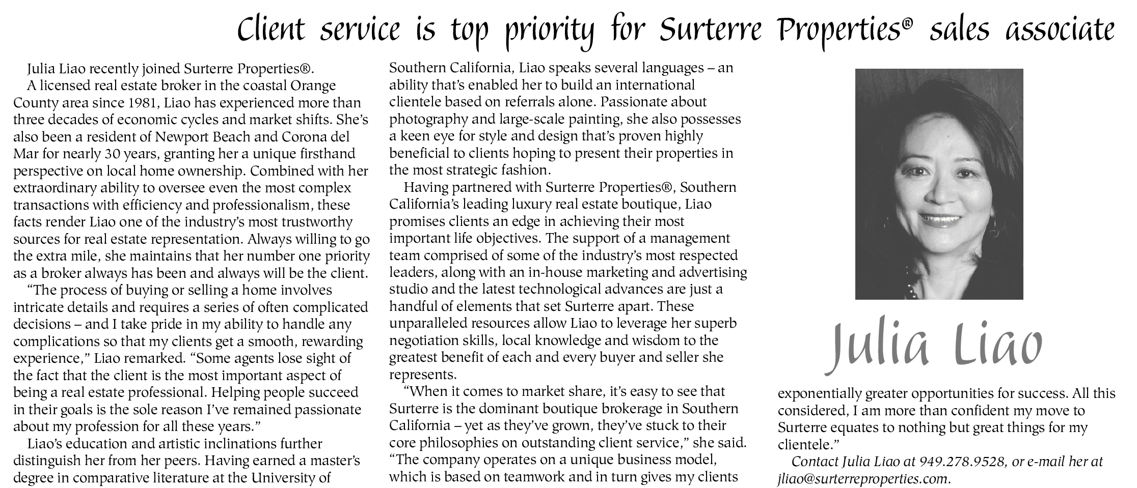 Contact Julia Liao at 949.278.9528, or e-mail her at jliao@surterreproperties.com.
