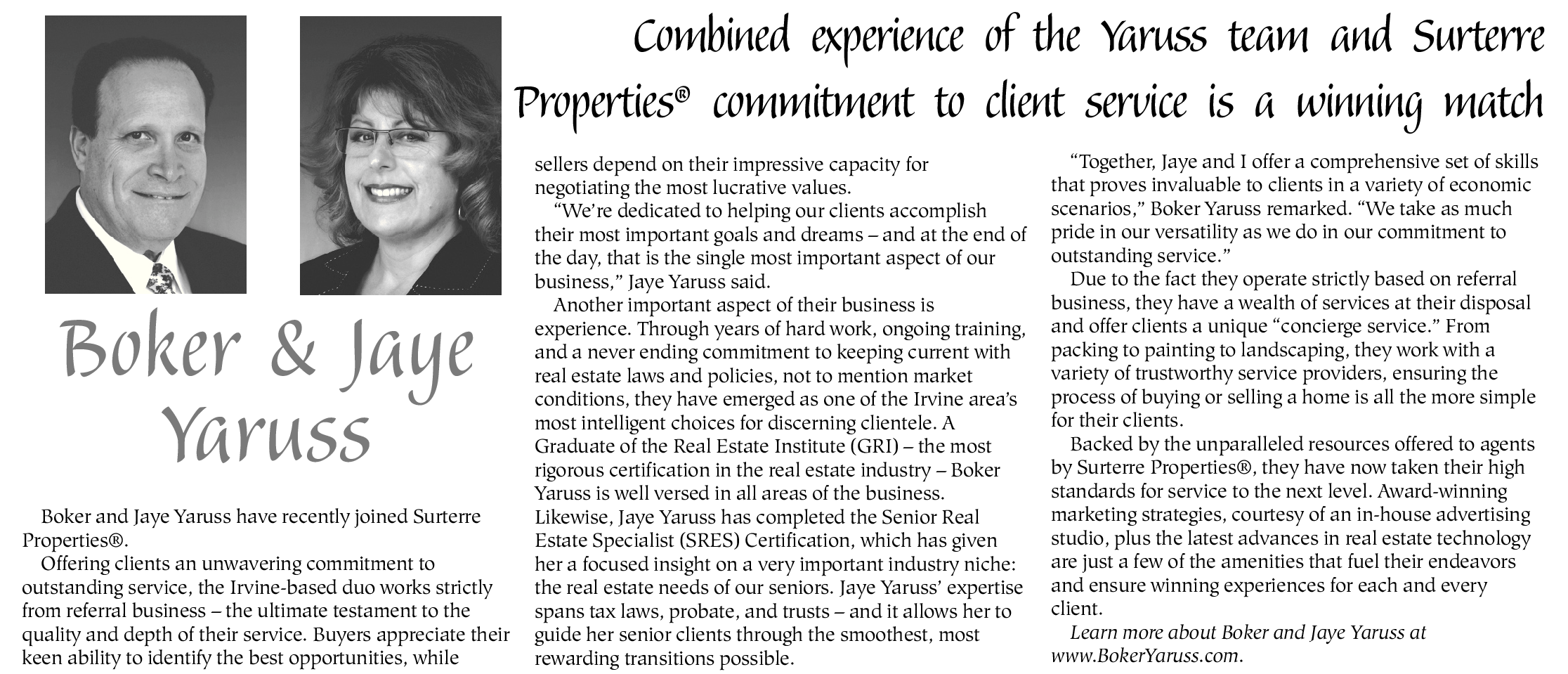 Another important aspect of their business is experience. Through years of hard work, ongoing training, and a never ending commitment to keeping current with real estate laws and policies, not to mention market conditions, they have emerged as one of the Irvine area’s most intelligent choices for discerning clientele. A Graduate of the Real Estate Institute (GRI) – the most rigorous certification in the real estate industry – Boker Yaruss is well versed in all areas of the business. Likewise, Jaye Yaruss has completed the Senior Real Estate Specialist (SRES) Certification, which has given her a focused insight on a very important industry niche: the real estate needs of our seniors. Jaye Yaruss’ expertise spans tax laws, probate, and trusts – and it allows her to guide her senior clients through the smoothest, most rewarding transitions possible.