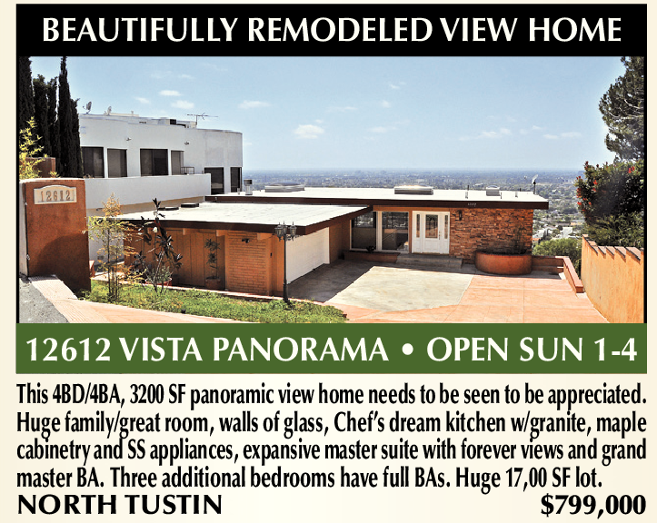 12612 VISTA PANORAMA • OPEN SUN 1-4 This 4BD/4BA, 3200 SF panoramic view home needs to be seen to be appreciated. Huge family/great room, walls of glass, Chef’s dream kitchen w/granite, maple cabinetry and SS appliances, expansive master suite with forever views and grand master BA. Three additional bedrooms have full BAs. Huge 17,00 SF lot. NORTH TUSTIN $799,000