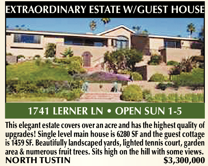 EXTRAORDINARY ESTATE W/GUEST HOUSE 1741 LERNER LN • OPEN SUN 1-5 This elegant estate covers over an acre and has the highest quality of upgrades! Single level main house is 6280 SF and the guest cottage is 1459 SF. Beautifully landscaped yards, lighted tennis court, garden area & numerous fruit trees. Sits high on the hill with some views. NORTH TUSTIN $3,300,000