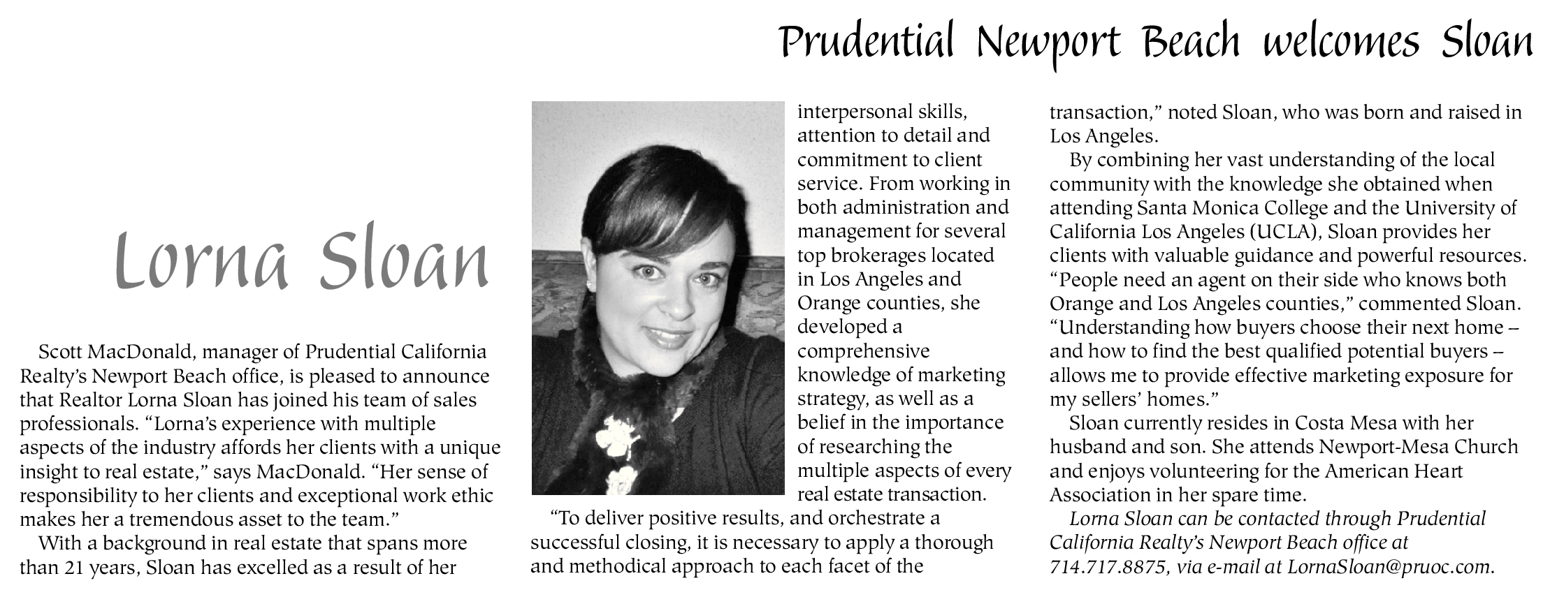 Lorna Sloan can be contacted through Prudential California Realty’s Newport Beach office at 714.717.8875, via e-mail at LornaSloan@pruoc.com.