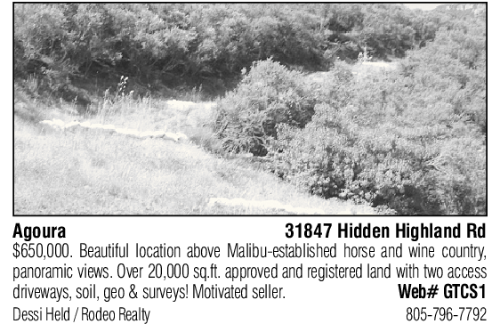Agoura 31847 Hidden Highland Rd $650,000. Beautiful location above Malibu-established horse and wine country, panoramic views. Over 20,000 sq.ft. approved and registered land with two access driveways, soil, geo & surveys! Motivated seller. Web# GTCS1 Dessi Held / Rodeo Realty 805-796-7792
