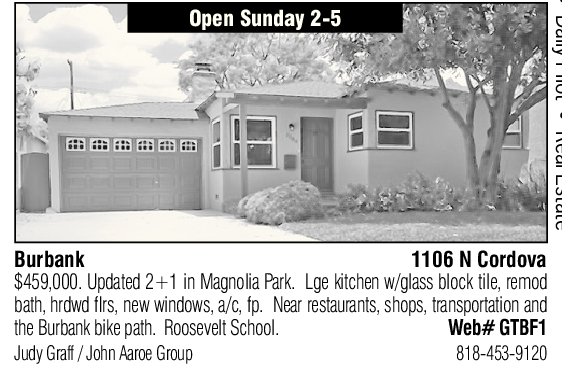 Open Sunday 2-5 Burbank 1106 N Cordova $459,000. Updated 2+1 in Magnolia Park. Lge kitchen w/glass block tile, remod bath, hrdwd flrs, new windows, a/c, fp. Near restaurants, shops, transportation and the Burbank bike path. Roosevelt School. Web# GTBF1 Judy Graff / John Aaroe Group 818-453-9120