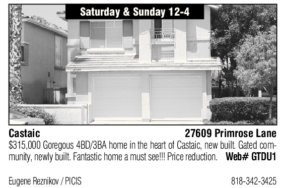 Castaic 27609 Primrose Lane $315,000 Goregous 4BD/3BA home in the heart of Castaic, new built. Gated community, newly built. Fantastic home a must see!!! Price reduction. Web# GTDU1 Eugene Reznikov / PICIS 818-342-3425