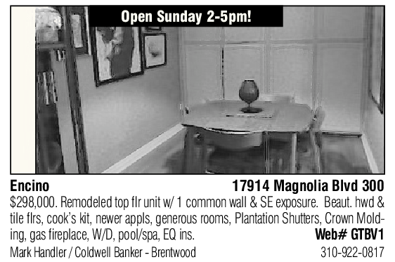 Encino 17914 Magnolia Blvd 300 tile flrs, cook’s kit, newer appls, generous rooms, Plantation Shutters, Crown Mold $298,000. Remodeled top flr unit w/ 1 common wall & SE exposure. Beaut. hwd & ing, gas fireplace, W/D, pool/spa, EQ ins. Web# GTBV1 Mark Handler / Coldwell Banker - Brentwood 310-922-0817