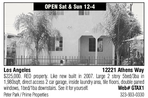 OPEN Sat & Sun 12-4 Los Angeles 12221 Athens Way $225,000. REO property. Like new built in 2007. Large 2 story 5bed/3ba in windows, 1bed/1ba downstairs. See it for yourself. Web# GTAX1 1,980sqft, direct access 2 car garage, inside laundry area, tile floors, double paned Peter Park / Prime Properties 323-933-0330