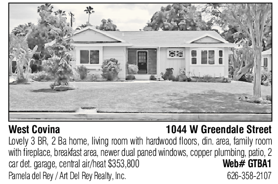 West Covina 1044 W Greendale Street Lovely 3 BR, 2 Ba home, living room with hardwood floors, din. area, family room with fireplace, breakfast area, newer dual paned windows, copper plumbing, patio, 2 car det. garage, central air/heat $353,800 Web# GTBA1 Pamela del Rey / Art Del Rey Realty, Inc. 626-358-2107