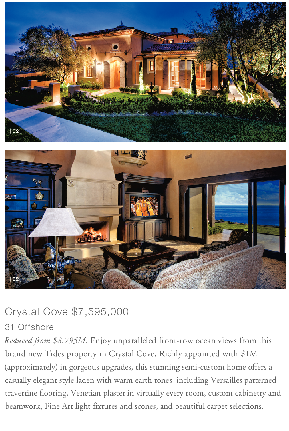 31 Offshore Reduced from $8.795M. Enjoy unparalleled front-row ocean views from this brand new Tides property in Crystal Cove. Richly appointed with $1M (approximately) in gorgeous upgrades, this stunning semi-custom home offers a casually elegant style laden with warm earth tones–including Versailles patterned travertine flooring, Venetian plaster in virtually every room, custom cabinetry and beamwork, Fine Art light fixtures and scones, and beautiful carpet selections.