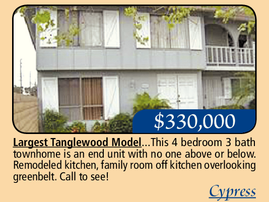 Largest Tanglewood Model...This 4 bedroom 3 bath townhome is an end unit with no one above or below. Remodeled kitchen, family room off kitchen overlooking greenbelt. Call to see!