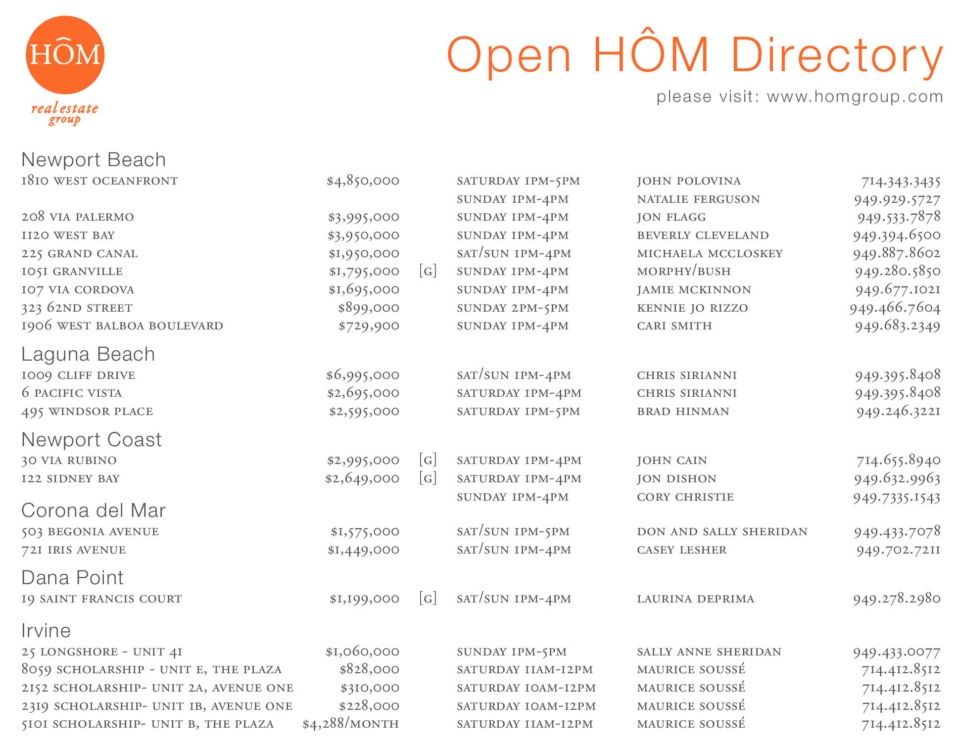 1009 cliff drive $6,995,000 sat/sun 1pm-4pm chris sirianni 949.395.8408 6 pacific vista $2,695,000 saturday 1pm-4pm chris sirianni 949.395.8408 495 windsor place $2,595,000 saturday 1pm-5pm brad hinman 949.246.3221