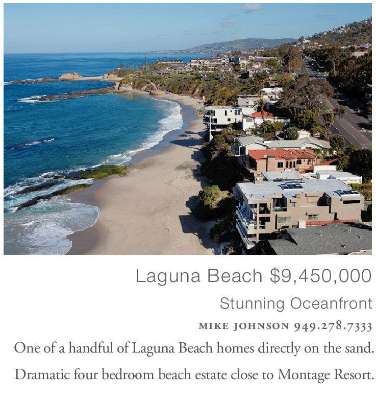Laguna Beach $9,450,000 Stunning Oceanfront mike johnson 949.278.7333 One of a handful of Laguna Beach homes directly on the sand. Dramatic four bedroom beach estate close to Montage Resort.