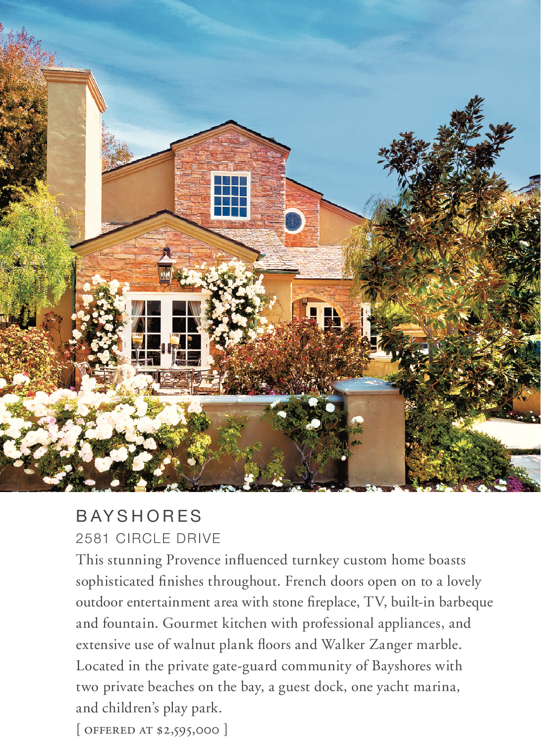 B AYS H O R E S 2581 CIRCLE DRIVE This stunning Provence influenced turnkey custom home boasts sophisticated finishes throughout. French doors open on to a lovely outdoor entertainment area with stone fireplace, TV, built-in barbeque and fountain. Gourmet kitchen with professional appliances, and extensive use of walnut plank floors and Walker Zanger marble. Located in the private gate-guard community of Bayshores with two private beaches on the bay, a guest dock, one yacht marina, and children’s play park. [ offered at $2,595,000 ]
