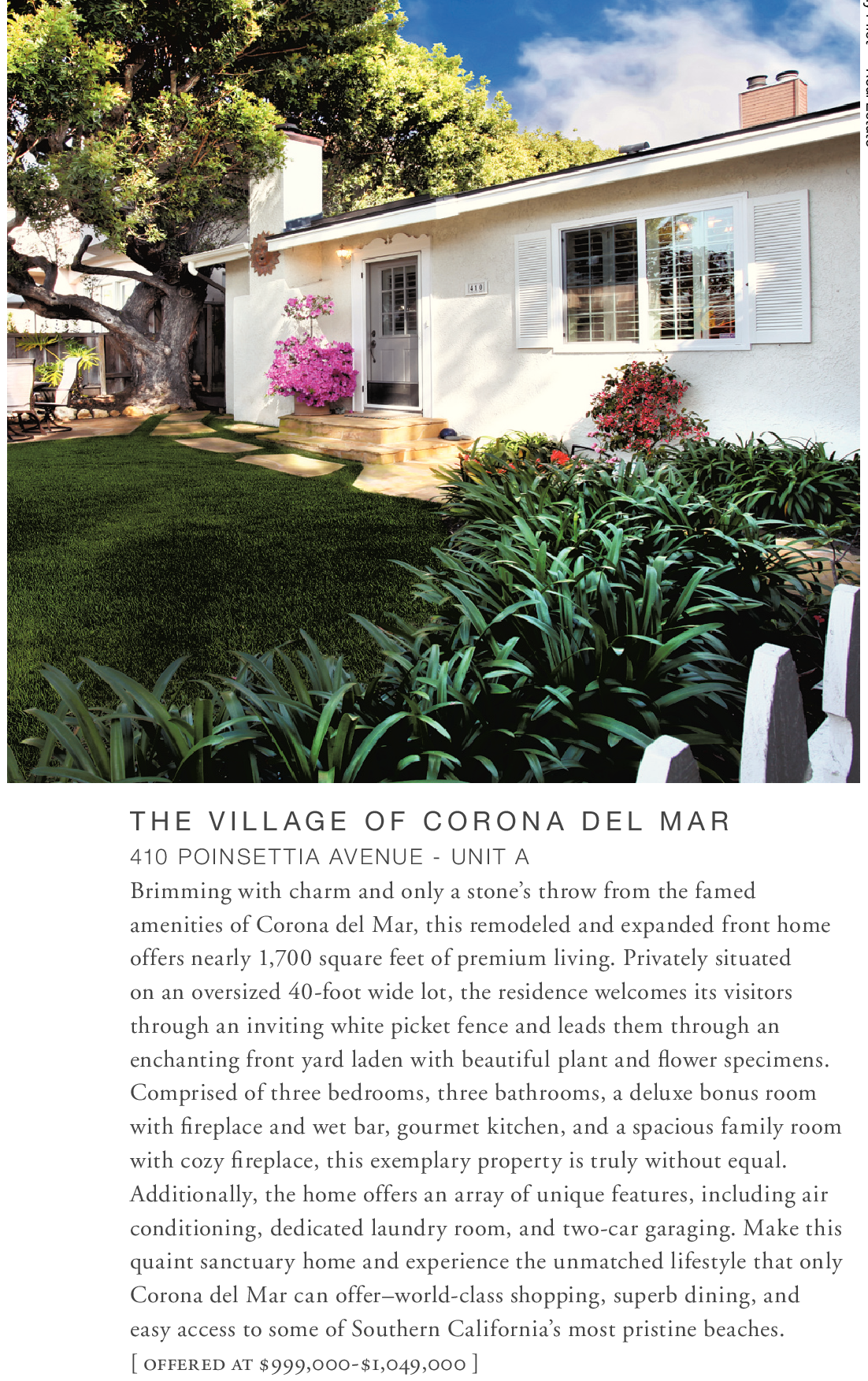 T H E V I L L AG E O F C O R O N A D E L M A R 410 POINSETTIA AVENUE - UNIT A Brimming with charm and only a stone’s throw from the famed amenities of Corona del Mar, this remodeled and expanded front home offers nearly 1,700 square feet of premium living. Privately situated on an oversized 40-foot wide lot, the residence welcomes its visitors through an inviting white picket fence and leads them through an enchanting front yard laden with beautiful plant and flower specimens. Comprised of three bedrooms, three bathrooms, a deluxe bonus room with fireplace and wet bar, gourmet kitchen, and a spacious family room with cozy fireplace, this exemplary property is truly without equal. Additionally, the home offers an array of unique features, including air conditioning, dedicated laundry room, and two-car garaging. Make this quaint sanctuary home and experience the unmatched lifestyle that only Corona del Mar can offer–world-class shopping, superb dining, and easy access to some of Southern California’s most pristine beaches. [ offered at $999,000-$1,049,000 ]