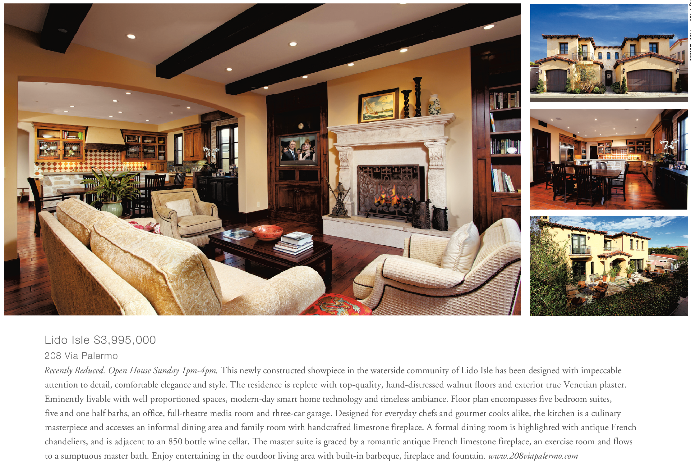 Lido Isle $3,995,000 208 Via Palermo Recently Reduced. Open House Sunday 1pm-4pm. This newly constructed showpiece in the waterside community of Lido Isle has been designed with impeccable attention to detail, comfortable elegance and style. The residence is replete with top-quality, hand-distressed walnut floors and exterior true Venetian plaster. Eminently livable with well proportioned spaces, modern-day smart home technology and timeless ambiance. Floor plan encompasses five bedroom suites, five and one half baths, an office, full-theatre media room and three-car garage. Designed for everyday chefs and gourmet cooks alike, the kitchen is a culinary masterpiece and accesses an informal dining area and family room with handcrafted limestone fireplace. A formal dining room is highlighted with antique French chandeliers, and is adjacent to an 850 bottle wine cellar. The master suite is graced by a romantic antique French limestone fireplace, an exercise room and flows to a sumptuous master bath. Enjoy entertaining in the outdoor living area with built-in barbeque, fireplace and fountain. www.208viapalermo.com