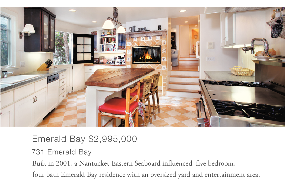 Emerald Bay $2,995,000 731 Emerald Bay Built in 2001, a Nantucket-Eastern Seaboard influenced five bedroom, four bath Emerald Bay residence with an oversized yard and entertainment area.