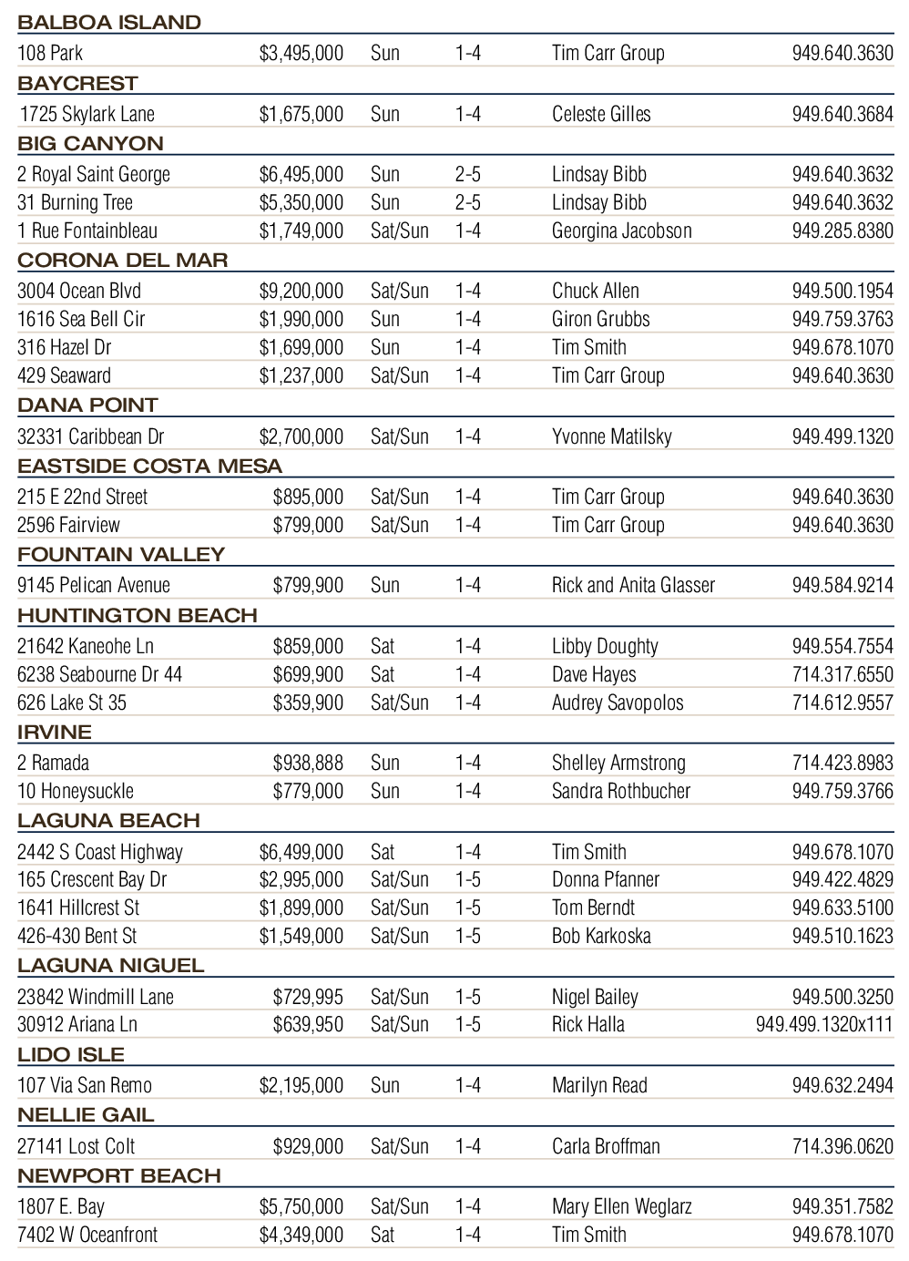 2 Royal Saint George $6,495,000 Sun 2-5 Lindsay Bibb 949.640.3632 31 Burning Tree $5,350,000 Sun 2-5 Lindsay Bibb 949.640.3632 1 Rue Fontainbleau $1,749,000 Sat/Sun 1-4 Georgina Jacobson 949.285.8380 CORONA DEL MAR 3004 Ocean Blvd $9,200,000 Sat/Sun 1-4 Chuck Allen 949.500.1954 1616 Sea Bell Cir $1,990,000 Sun 1-4 Giron Grubbs 949.759.3763 316 Hazel Dr $1,699,000 Sun 1-4 Tim Smith 949.678.1070 429 Seaward $1,237,000 Sat/Sun 1-4 Tim Carr Group 949.640.3630 DANA POINT 32331 Caribbean Dr $2,700,000 Sat/Sun 1-4 Yvonne Matilsky 949.499.1320 EASTSIDE COSTA MESA 215 E 22nd Street $895,000 Sat/Sun 1-4 Tim Carr Group 949.640.3630 2596 Fairview $799,000 Sat/Sun 1-4 Tim Carr Group 949.640.3630 FOUNTAIN VALLEY 9145 Pelican Avenue $799,900 Sun 1-4 Rick and Anita Glasser 949.584.9214 HUNTINGTON BEACH 21642 Kaneohe Ln $859,000 Sat 1-4 Libby Doughty 949.554.7554 6238 Seabourne Dr 44 $699,900 Sat 1-4 Dave Hayes 714.317.6550 626 Lake St 35 $359,900 Sat/Sun 1-4 Audrey Savopolos 714.612.9557 IRVINE 2 Ramada $938,888 Sun 1-4 Shelley Armstrong 714.423.8983 10 Honeysuckle $779,000 Sun 1-4 Sandra Rothbucher 949.759.3766 LAGUNA BEACH 2442 S Coast Highway $6,499,000 Sat 1-4 Tim Smith 949.678.1070 165 Crescent Bay Dr $2,995,000 Sat/Sun 1-5 Donna Pfanner 949.422.4829 1641 Hillcrest St $1,899,000 Sat/Sun 1-5 Tom Berndt 949.633.5100 426-430 Bent St $1,549,000 Sat/Sun 1-5 Bob Karkoska 949.510.1623 LAGUNA NIGUEL 23842 Windmill Lane $729,995 Sat/Sun 1-5 Nigel Bailey 949.500.3250 30912 Ariana Ln $639,950 Sat/Sun 1-5 Rick Halla 949.499.1320x111 LIDO ISLE 107 Via San Remo $2,195,000 Sun 1-4 Marilyn Read 949.632.2494 NELLIE GAIL 27141 Lost Colt $929,000 Sat/Sun 1-4 Carla Broffman 714.396.0620 NEWPORT BEACH 1807 E. Bay $5,750,000 Sat/Sun 1-4 Mary Ellen Weglarz 949.351.7582 7402 W Oceanfront $4,349,000 Sat 1-4 Tim Smith 949.678.1070