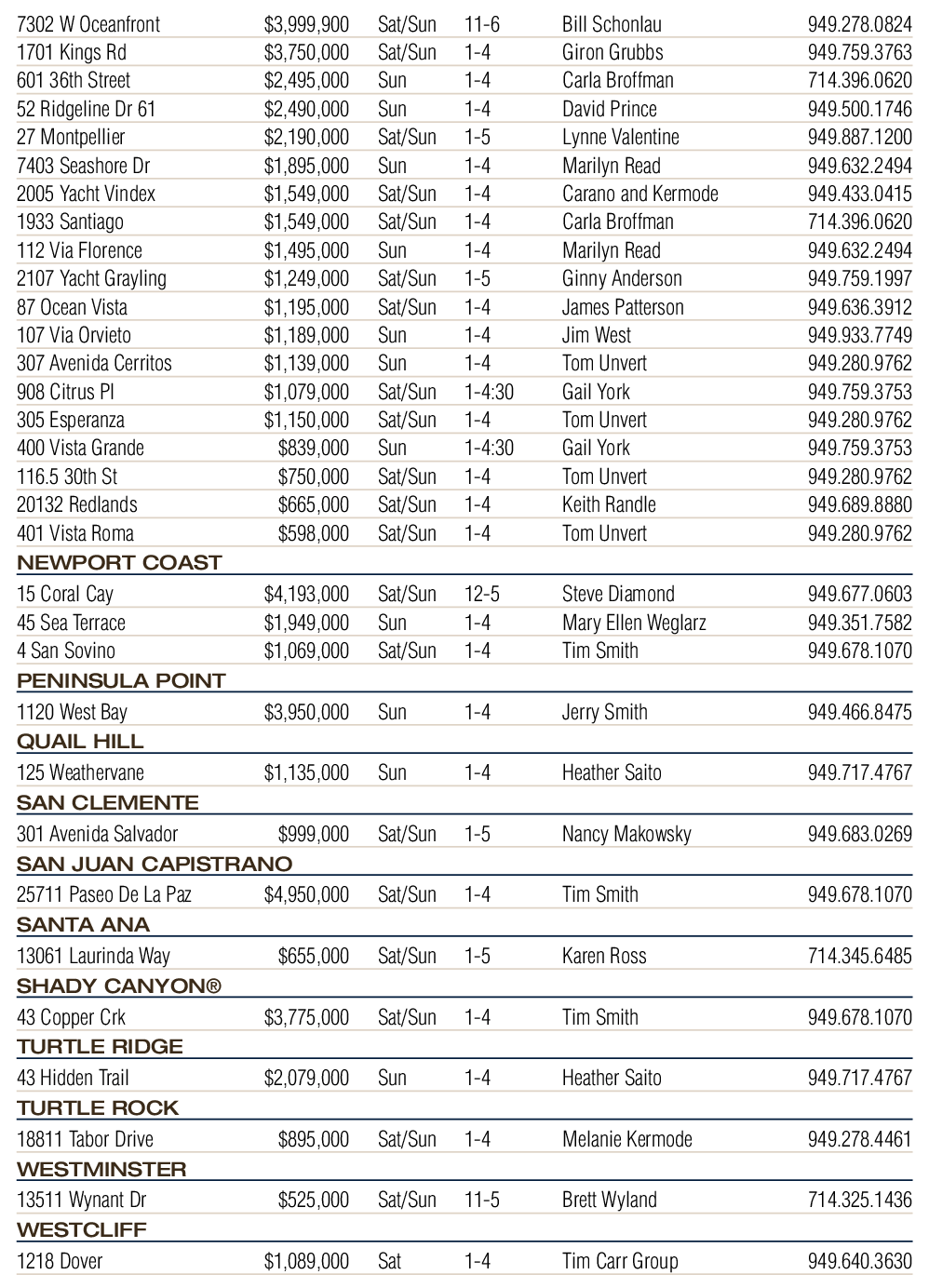 7302 W Oceanfront $3,999,900 Sat/Sun 11-6 Bill Schonlau 949.278.0824 1701 Kings Rd $3,750,000 Sat/Sun 1-4 Giron Grubbs 949.759.3763 601 36th Street $2,495,000 Sun 1-4 Carla Broffman 714.396.0620 52 Ridgeline Dr 61 $2,490,000 Sun 1-4 David Prince 949.500.1746 27 Montpellier $2,190,000 Sat/Sun 1-5 Lynne Valentine 949.887.1200 7403 Seashore Dr $1,895,000 Sun 1-4 Marilyn Read 949.632.2494 2005 Yacht Vindex $1,549,000 Sat/Sun 1-4 Carano and Kermode 949.433.0415 1933 Santiago $1,549,000 Sat/Sun 1-4 Carla Broffman 714.396.0620 112 Via Florence $1,495,000 Sun 1-4 Marilyn Read 949.632.2494 2107 Yacht Grayling $1,249,000 Sat/Sun 1-5 Ginny Anderson 949.759.1997 87 Ocean Vista $1,195,000 Sat/Sun 1-4 James Patterson 949.636.3912 107 Via Orvieto $1,189,000 Sun 1-4 Jim West 949.933.7749 307 Avenida Cerritos $1,139,000 Sun 1-4 Tom Unvert 949.280.9762 908 Citrus Pl $1,079,000 Sat/Sun 1-4:30 Gail York 949.759.3753 305 Esperanza $1,150,000 Sat/Sun 1-4 Tom Unvert 949.280.9762 400 Vista Grande $839,000 Sun 1-4:30 Gail York 949.759.3753 116.5 30th St $750,000 Sat/Sun 1-4 Tom Unvert 949.280.9762 20132 Redlands $665,000 Sat/Sun 1-4 Keith Randle 949.689.8880 401 Vista Roma $598,000 Sat/Sun 1-4 Tom Unvert 949.280.9762 NEWPORT COAST 15 Coral Cay $4,193,000 Sat/Sun 12-5 Steve Diamond 949.677.0603 45 Sea Terrace $1,949,000 Sun 1-4 Mary Ellen Weglarz 949.351.7582 4 San Sovino $1,069,000 Sat/Sun 1-4 Tim Smith 949.678.1070 PENINSULA POINT 1120 West Bay $3,950,000 Sun 1-4 Jerry Smith 949.466.8475 QUAIL HILL 125 Weathervane $1,135,000 Sun 1-4 Heather Saito 949.717.4767 SAN CLEMENTE 301 Avenida Salvador $999,000 Sat/Sun 1-5 Nancy Makowsky 949.683.0269 SAN JUAN CAPISTRANO 25711 Paseo De La Paz $4,950,000 Sat/Sun 1-4 Tim Smith 949.678.1070 SANTA ANA 13061 Laurinda Way $655,000 Sat/Sun 1-5 Karen Ross 714.345.6485 SHADY CANYON® 43 Copper Crk $3,775,000 Sat/Sun 1-4 Tim Smith 949.678.1070 TURTLE RIDGE 43 Hidden Trail $2,079,000 Sun 1-4 Heather Saito 949.717.4767 TURTLE ROCK 18811 Tabor Drive $895,000 Sat/Sun 1-4 Melanie Kermode 949.278.4461 WESTMINSTER 13511 Wynant Dr $525,000 Sat/Sun 11-5 Brett Wyland 714.325.1436 WESTCLIFF 1218 Dover $1,089,000 Sat 1-4 Tim Carr Group 949.640.3630