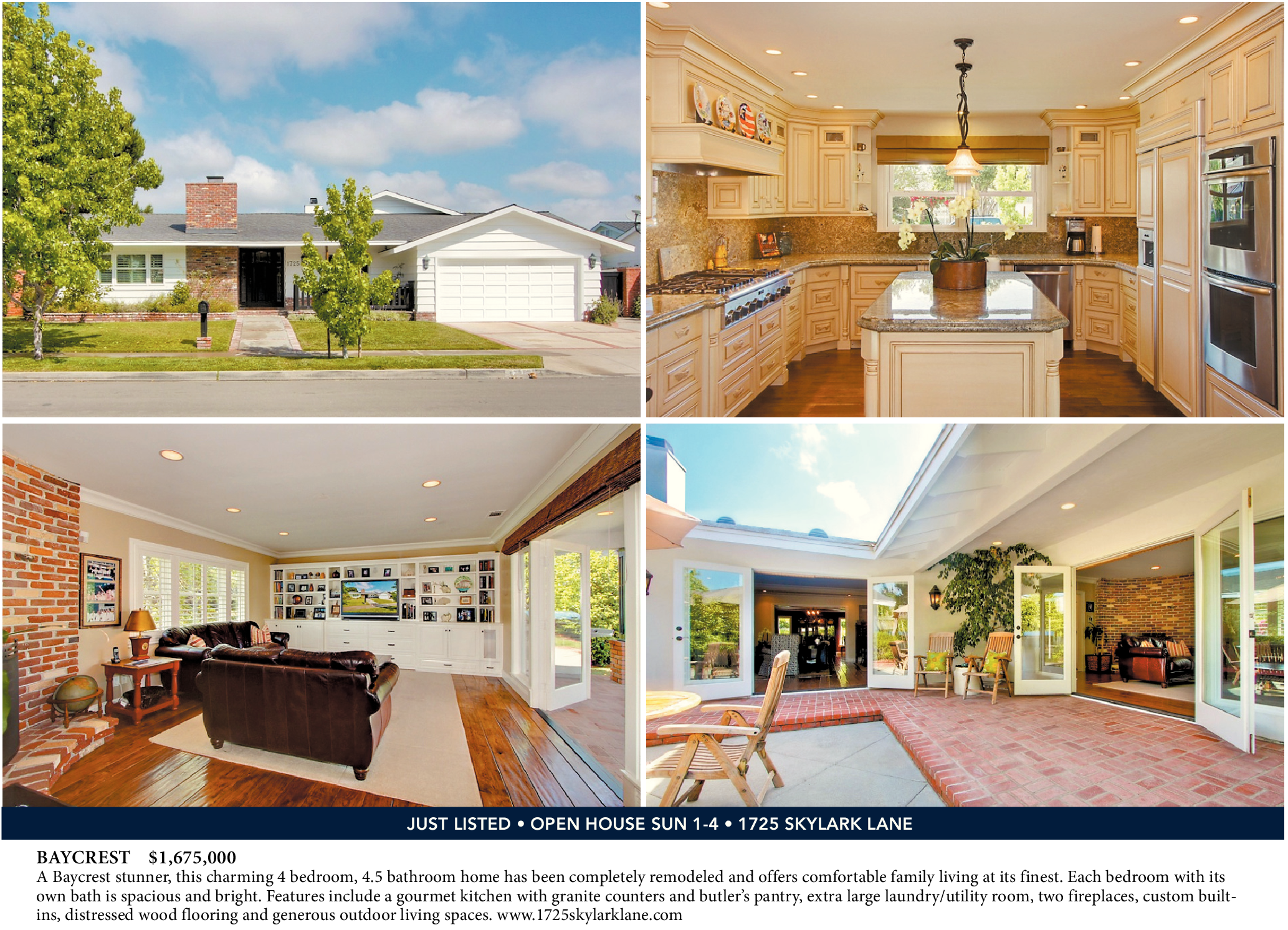 BAYCREST $1,675,000 A Baycrest stunner, this charming 4 bedroom, 4.5 bathroom home has been completely remodeled and offers comfortable family living at its finest. Each bedroom with its own bath is spacious and bright. Features include a gourmet kitchen with granite counters and butler’s pantry, extra large laundry/utility room, two fireplaces, custom builtins, distressed wood flooring and generous outdoor living spaces. www.1725skylarklane.com